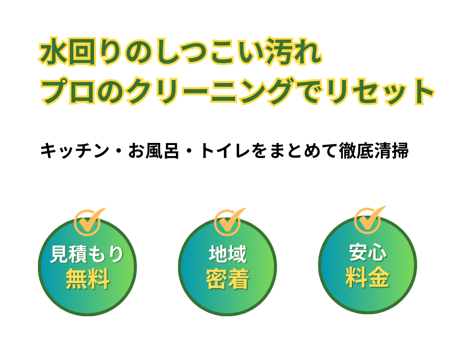 キッチン・お風呂・トイレ・洗面台など、気になる水回りをまとめて丁寧に清掃いたします。
